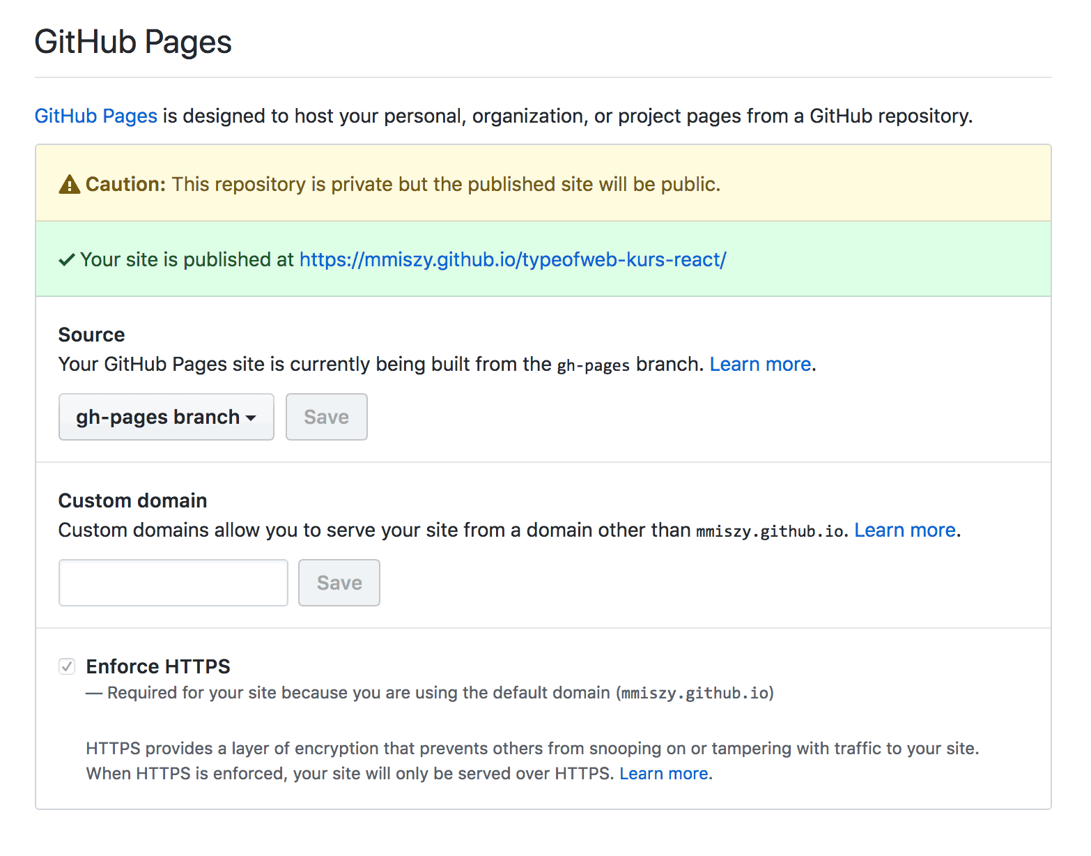 Ustaw, aby GitHub Pages korzystało ze stworzonego właśnie brancha gh-pages. U mnie wygląda to tak jak na pierwszym obrazku: