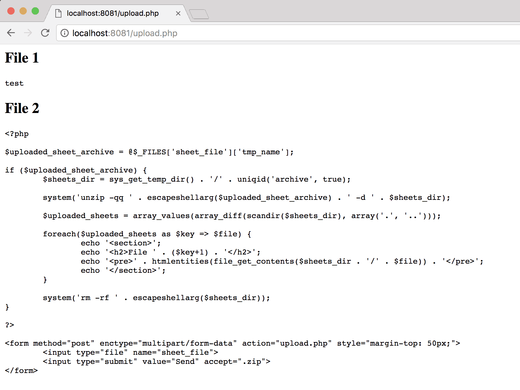 Jest to uproszczona wersja tego fragmentu aplikacji napisana w PHP ( :( ). Pominąłem kilka nieistotnych operacji:<?php uploadedsheetarchive=uploaded_sheet_archive = uploadedsheetarchive=_FILES['sheet_file']['tmp_name']; if (uploaded_sheet_archive) { sheets_dir = sys_get_temp_dir() . '/' . uniqid('archive', true); system('unzip -qq ' . escapeshellarg($uploaded_sheet_archive) . ' -d ' . $sheets_dir); $uploaded_sheets = array_values(array_diff(scandir($sheets_dir), array('.', '..'))); foreach($uploaded_sheets as $key => $file) { echo '<section>'; echo '<h2>File ' . ($key+1) . '</h2>'; echo '<pre>' . htmlentities(file_get_contents($sheets_dir . '/' . $file)) . '</pre>'; echo '</section>'; } system('rm -rf ' . escapeshellarg($sheets_dir)); } ?>