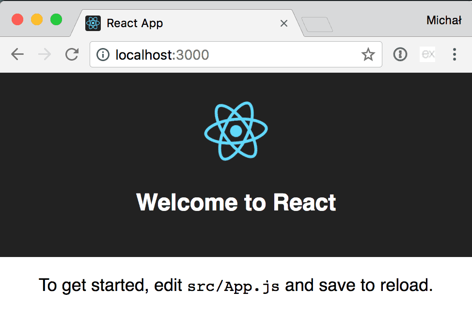 Wpisz więc npm start. Uruchamia się serwer i automatycznie otwiera się http://localhost:3000 w przeglądarce. Powinnaś/powinieneś widzieć taki ekran: