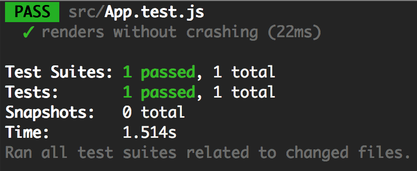 W folderze z aplikacją jest plik App.test.js. Zawiera jeden test. Ten test sprawdza czy komponent renderuje się prawidłowo — i jak widzisz, działa :) W jednym z kolejnych wpisów przyjrzę się bliżej testowaniu komponentów Reactowych z użyciem enzyme, którego na razie tutaj brakuje.