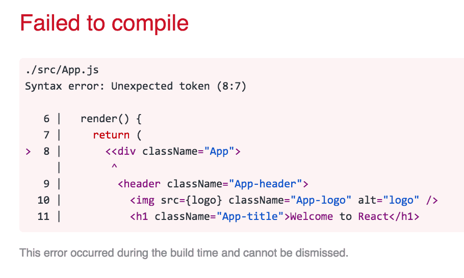 create-react-app automatycznie informuje Cię o wszystkich błędach składniowych — zarówno w przeglądarce, jak i w konsoli. Błędy są bardzo czytelnie oznaczone i konkretnie widać co jest do poprawy.